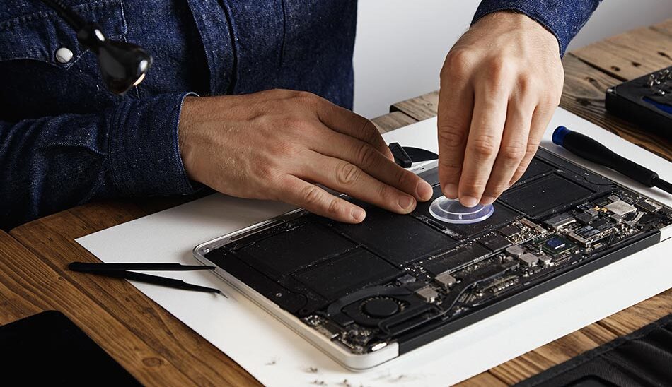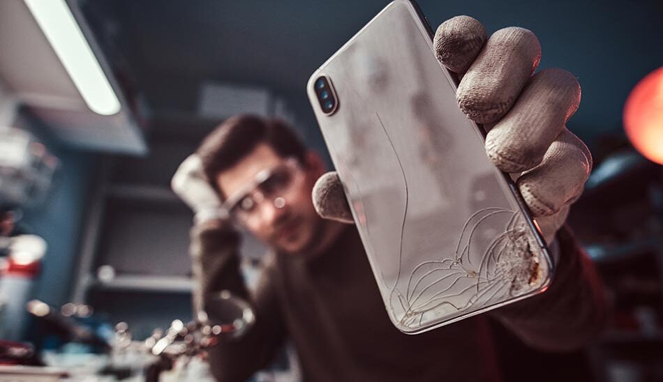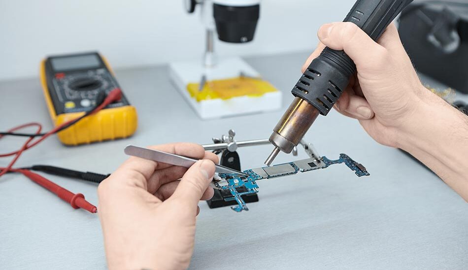 repairman soldering components motherboard while fixing damaged smartphone using tweezers iron